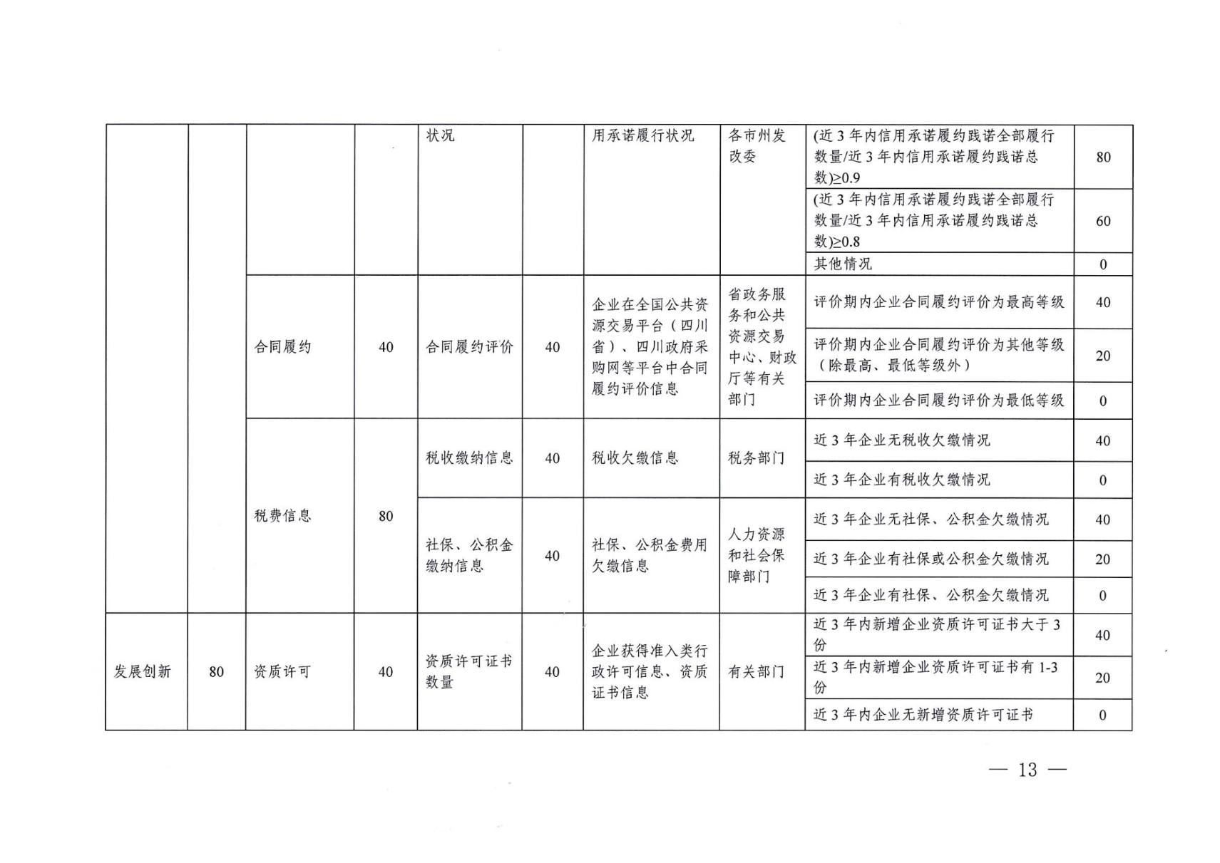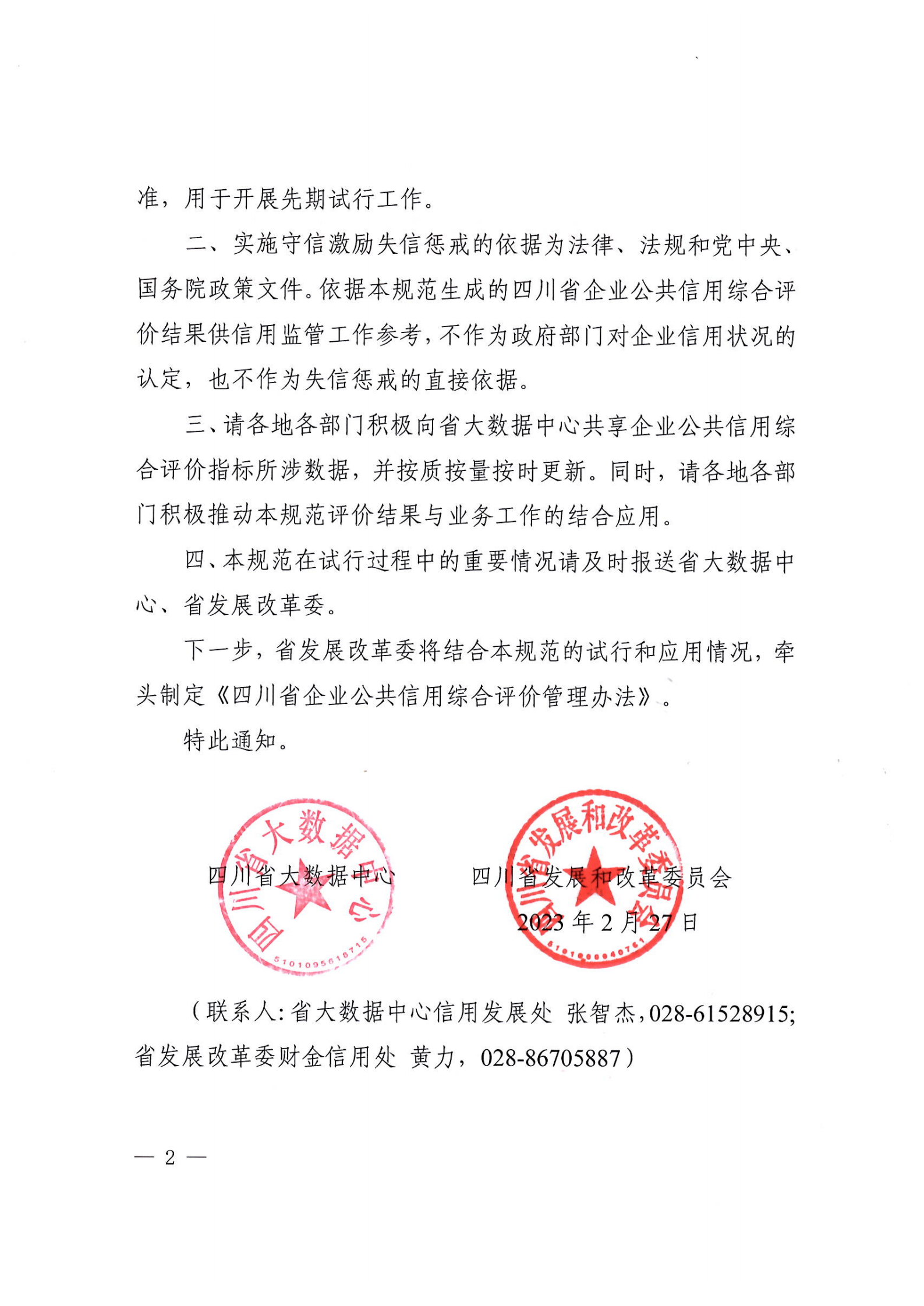 為貫徹落實《中共中央辦公廳國務(wù)院辦公廳關(guān)于推進社會信用體系建設(shè)高質(zhì)量發(fā)展促進形成新發(fā)展格局的意見》(中辦發(fā)〔2022〕25號)《國務(wù)院辦公廳關(guān)于加快推進社會信用體系建設(shè)構(gòu)建以信用為基礎(chǔ)的新型監(jiān)管機制的指導(dǎo)意見》(國辦發(fā)〔2019〕35號)等文件關(guān)于全面建立企業(yè)信用狀況綜合評價體系的要求,充分發(fā)揮信用信息的價值,經(jīng)深入調(diào)查研究和廣泛征求意見,省大數(shù)據(jù)中心、省發(fā)展改革委研究制定了《四川省企業(yè)公共信用綜合評價規(guī)范(試行,2023年版)》?,F(xiàn)印發(fā)給你們,請遵照執(zhí)行。